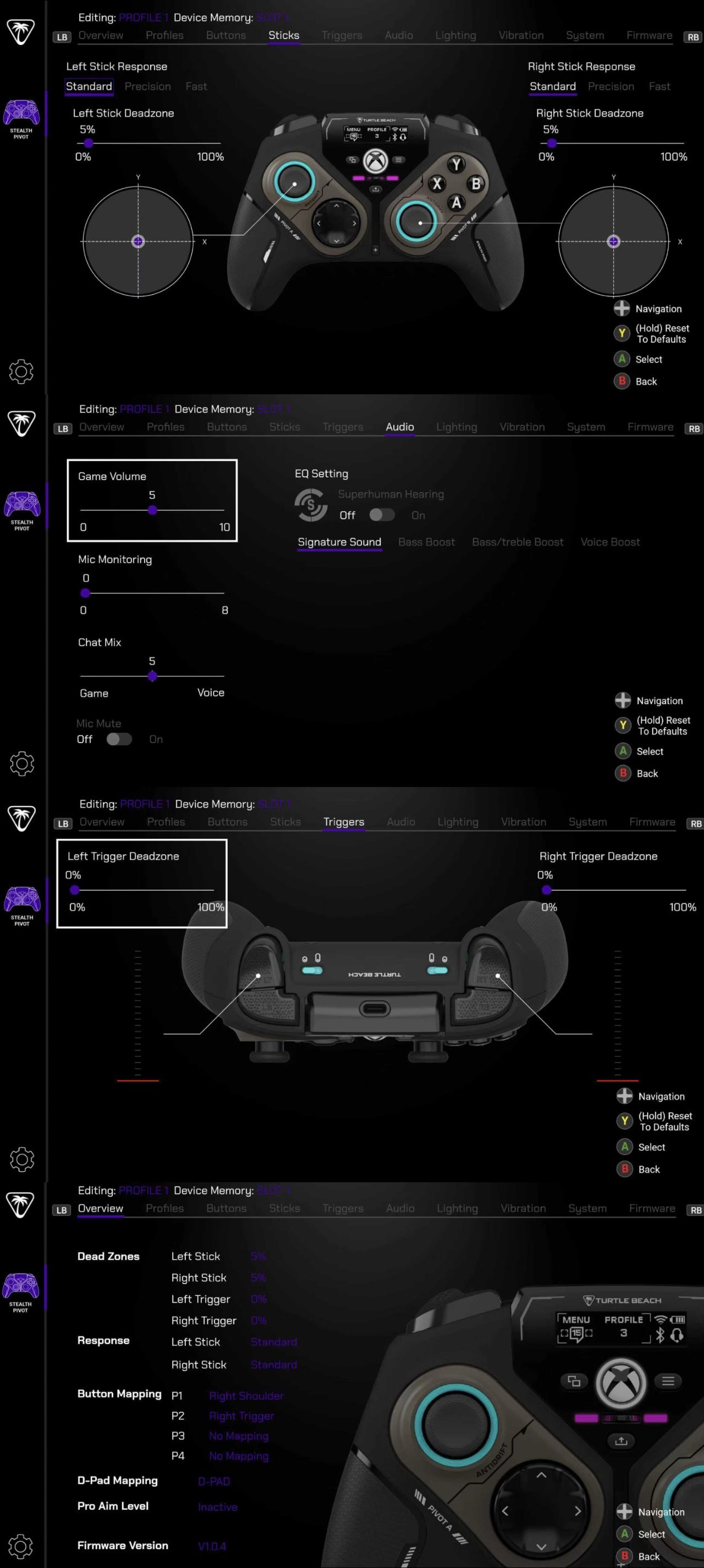 里面功能很多,比屏幕里的功能更为齐全,可以调节摇杆的响应速度/扳机死区/震动模式。挺好的,做的很到位很细致。不过还是老样子,不支持中文就很难受,只能通过拍照翻译来慢慢调节