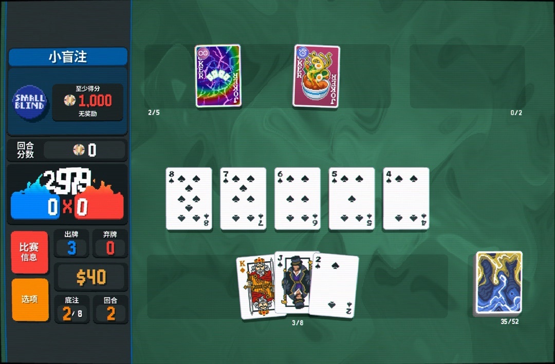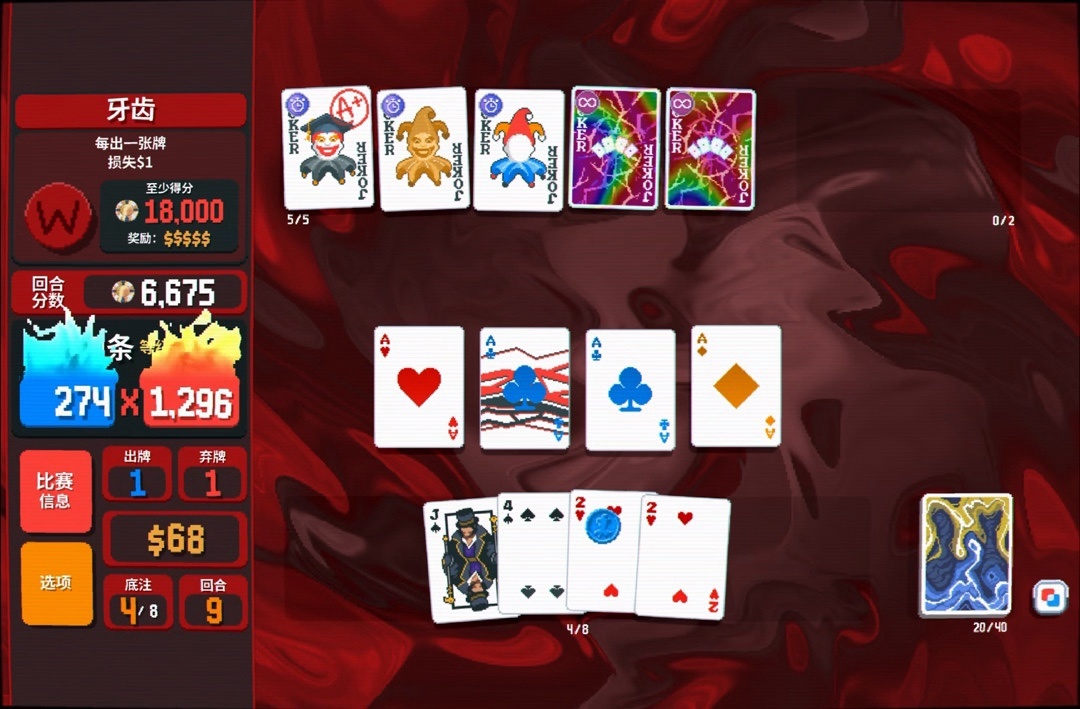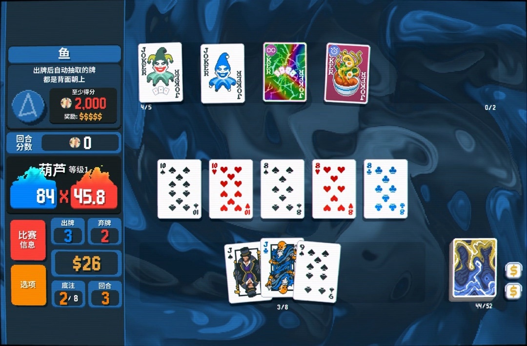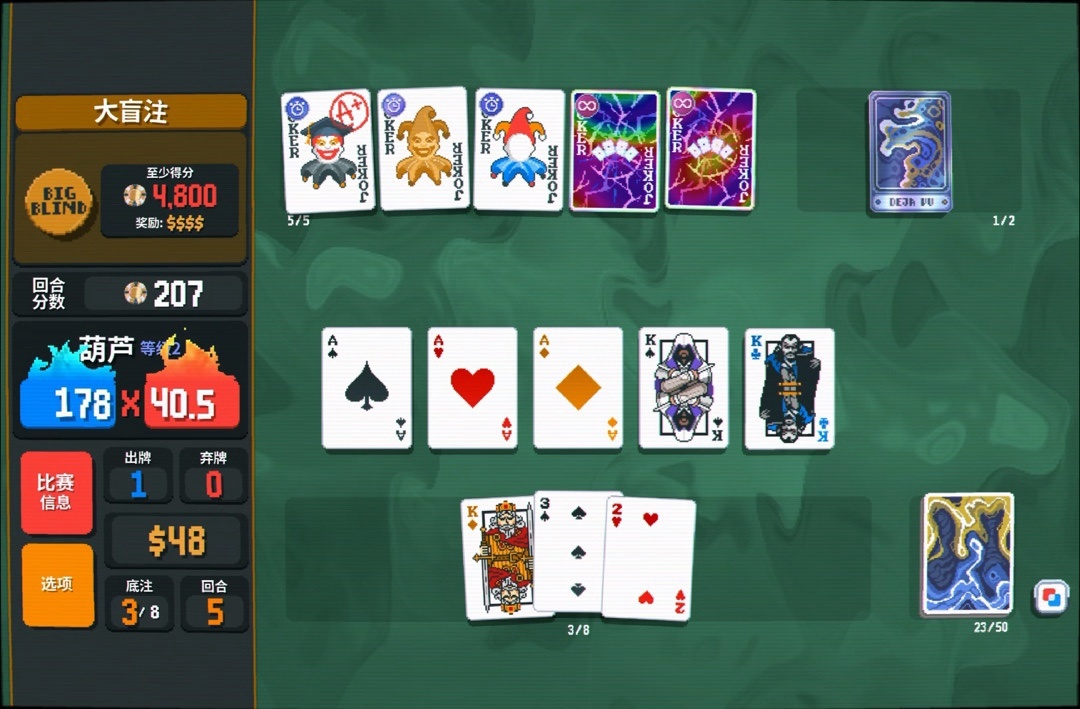 因为有古怪小丑,包含三条的牌型给12倍率,所以轻松过。