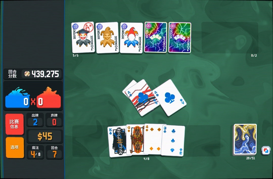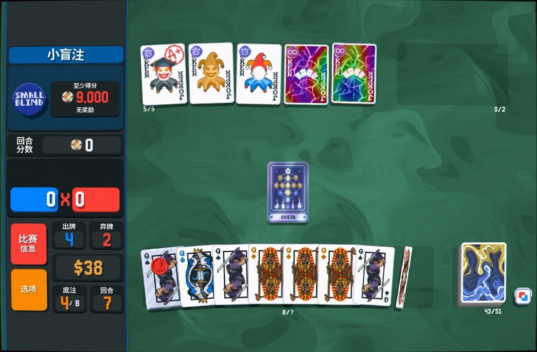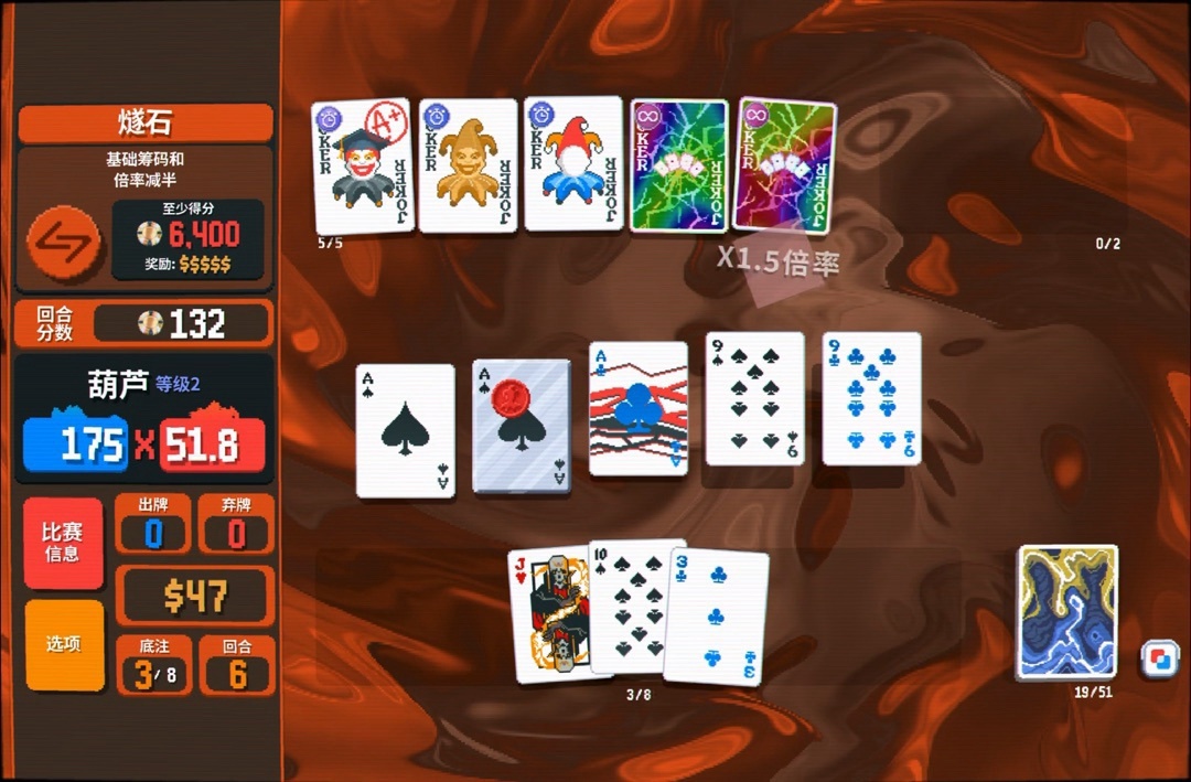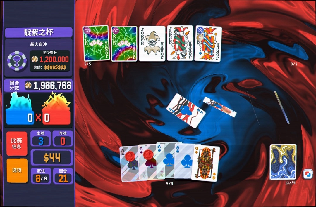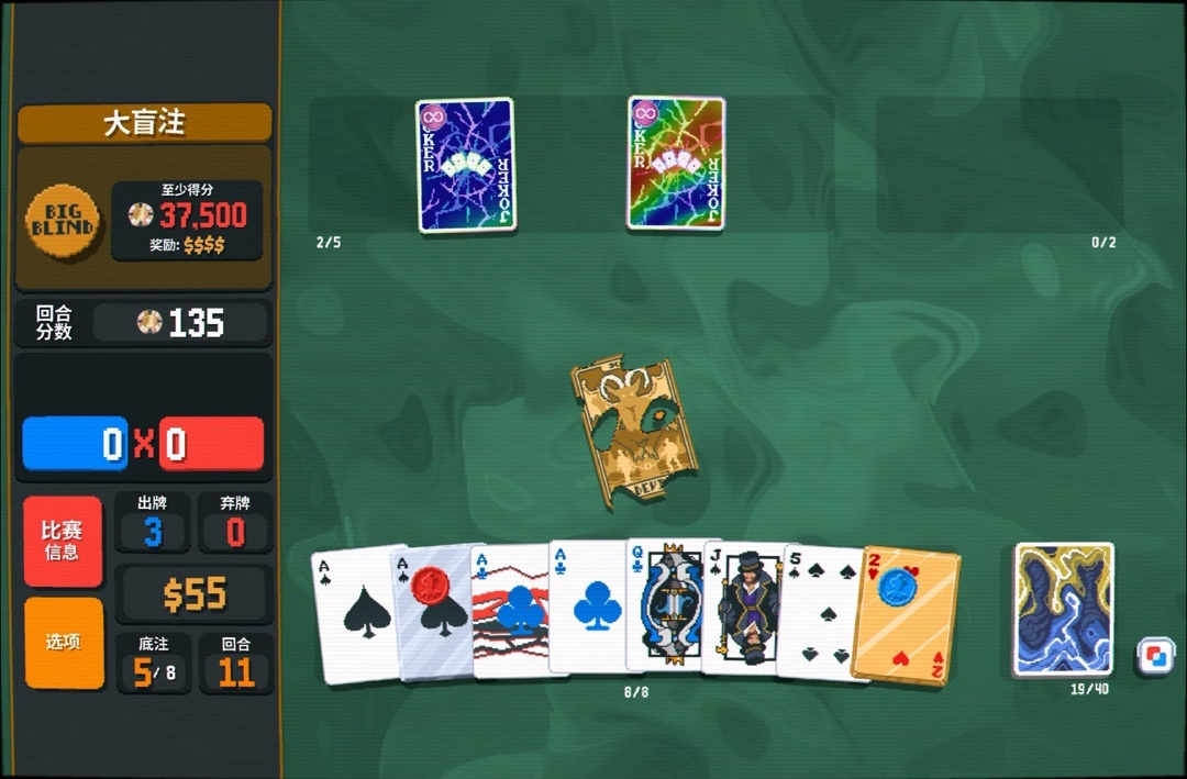 因为有古怪小丑,包含三条的牌型给12倍率,所以轻松过。