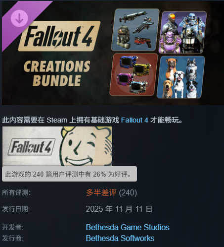 贝塞斯达于2025年11月10日发行的《辐射4:周年纪念版》虽如期亮相,却未获预期喝彩。这款为纪念广受好评的动作RPG问世十周年的版本在Steam平台遭遇广泛批评,玩家反馈呈现明显负面倾向。大量用户反映更新引发性能问题、与热门模组的兼容性冲突,且缺乏实质性改进以匹配其109元定价。