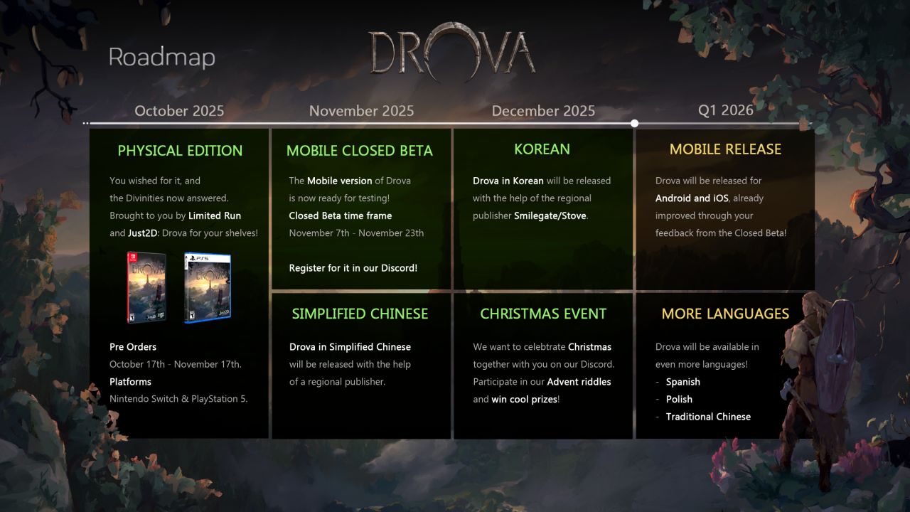 由独立团队Just2D打造的黑暗奇幻像素风ARPG《Drova - Forsaken Kin》(暂译《困兽之国》),在Steam平台收获90%特别好评后,终于迎来中文本土化更新——官方宣布将于11月中旬正式上线官方简体中文,同时发布大型免费DLC“灰烬誓约”,追加新区域与阵营结局。