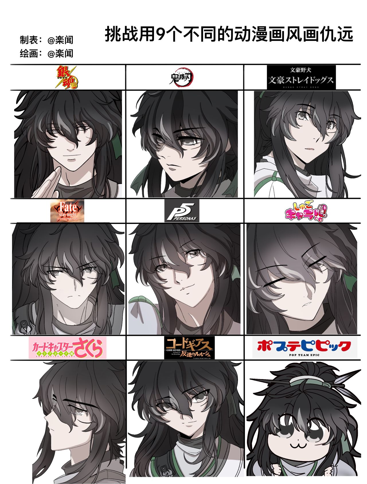 从一开始到最后分别是:银魂,鬼灭之刃,文豪野犬,fate/zero UBW,P5R,守护甜心,魔卡少女樱,反叛的鲁鲁修,pop子和pipi美的日常~