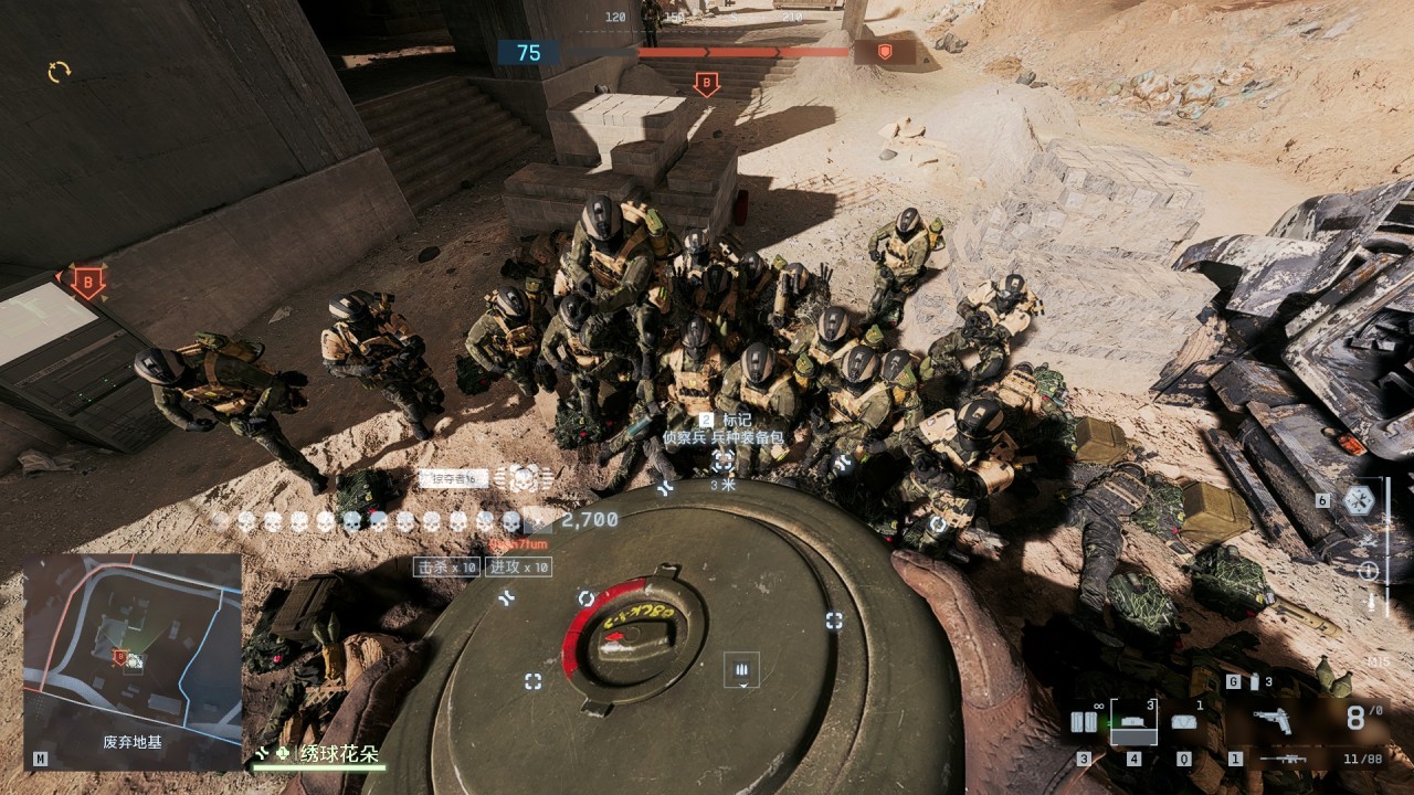 第三步,上去扔一个志愿兵的弹药/医疗箱,然后往下面丢反坦克地雷(不会弄双持弹药+地雷的的看下面)等待对方人机聚怪到脚下之后,扔出一个地雷到爆,AOE大范围击杀。