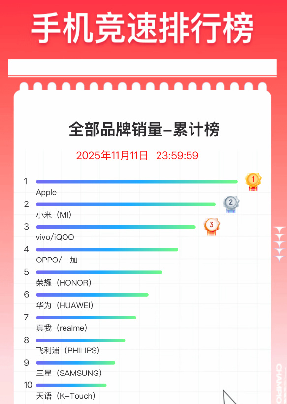 截至11月11日23:59:59,苹果、小米、vivo位列销量榜前三,这也算与大家原本的预期相符。