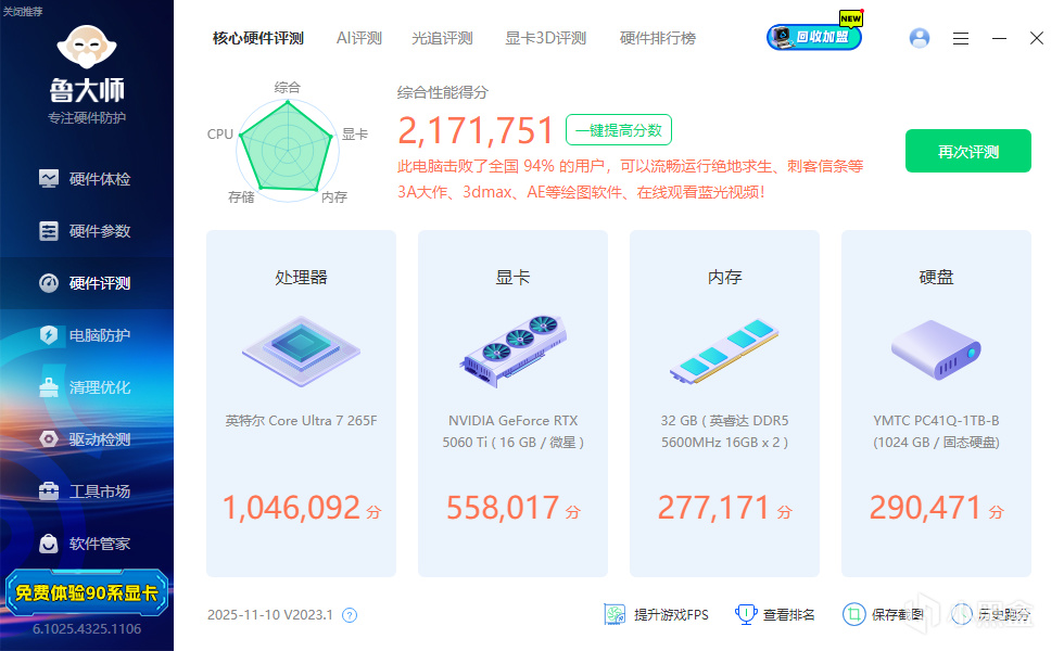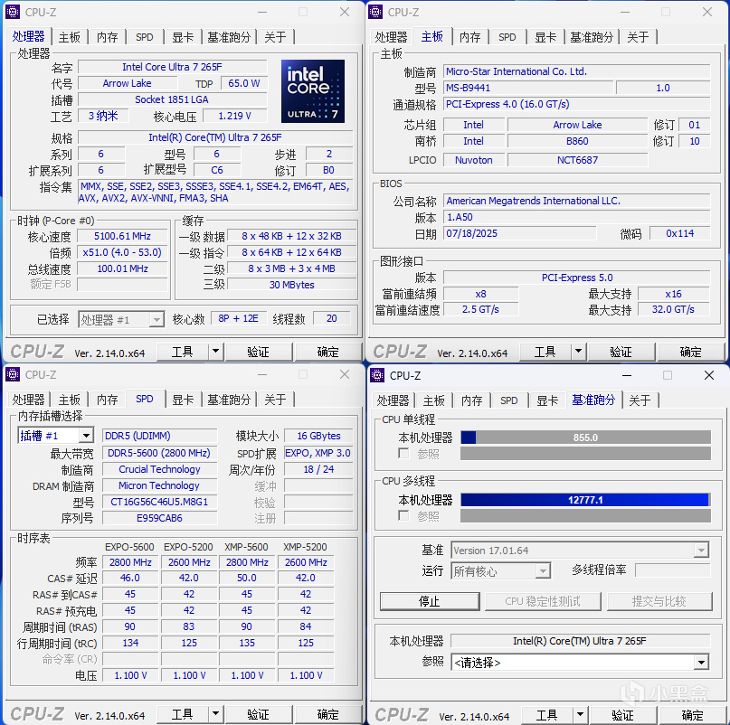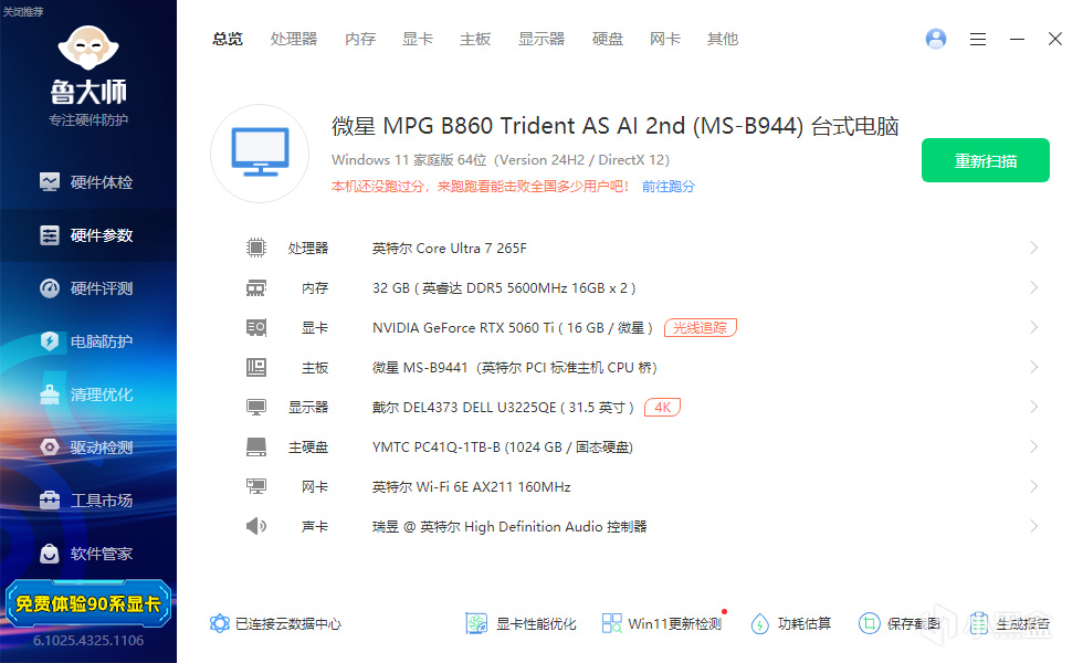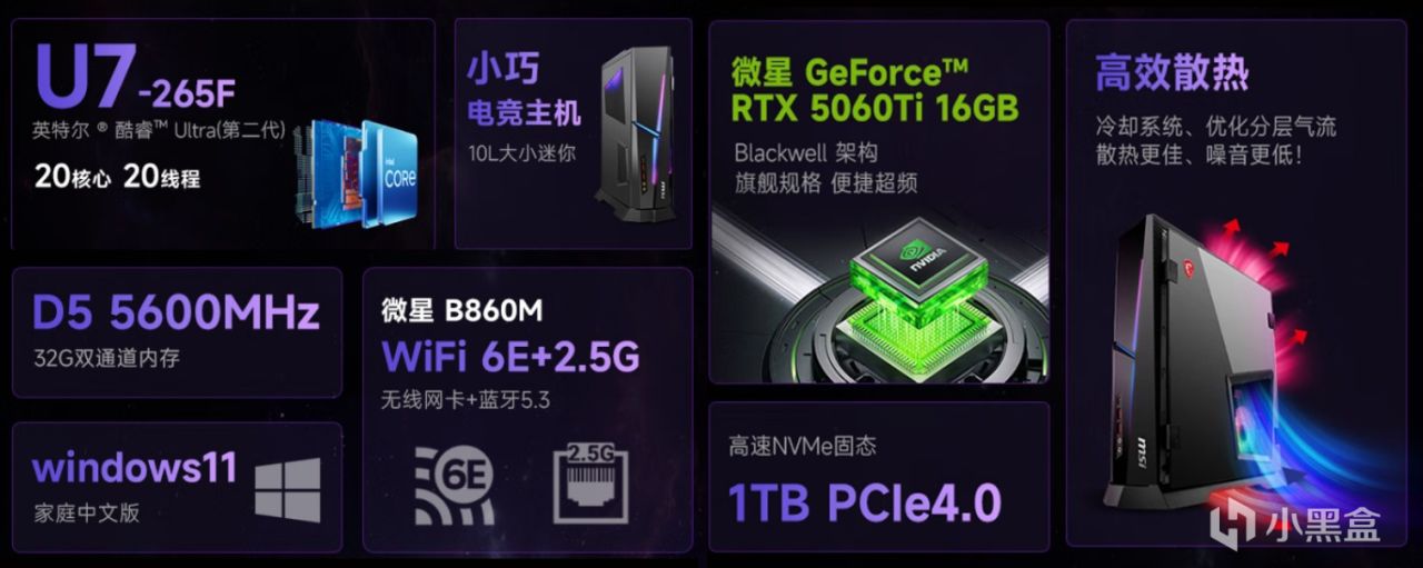 本次评测的微星海皇戟 AS主机属于顶配版本, 使用Ultra 7 265F 搭配 专属定制的B860主板,32G DDR5内存、1T SSD存储和5060ti标准版显卡。
