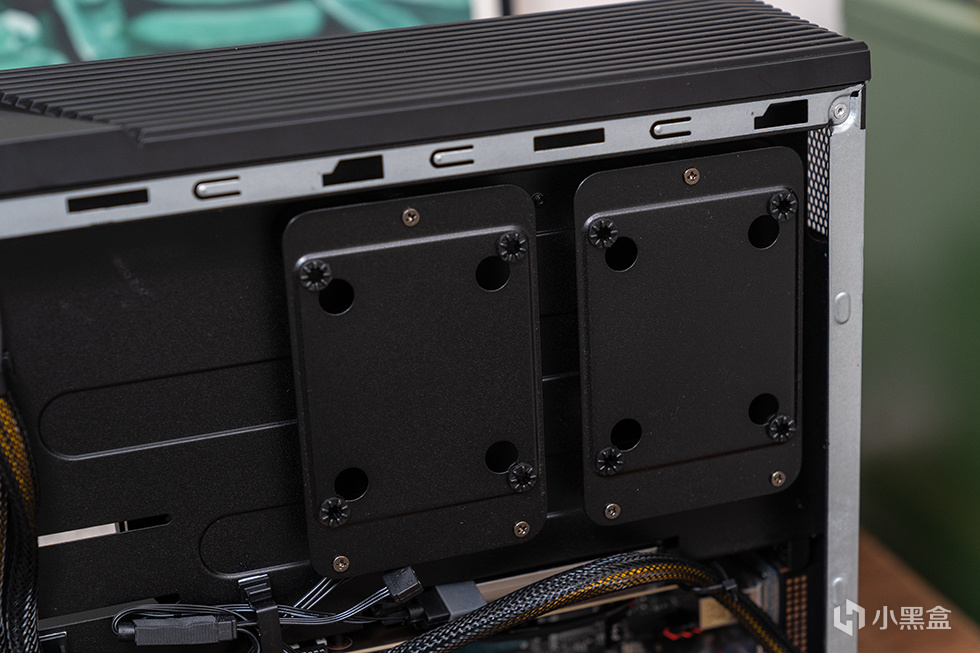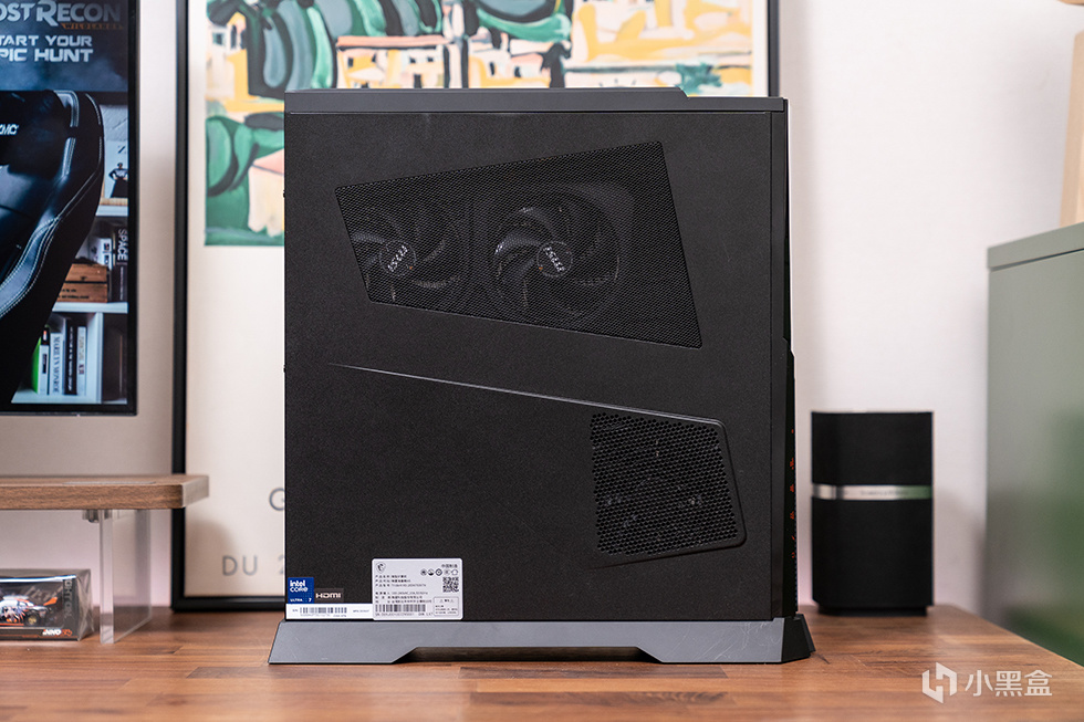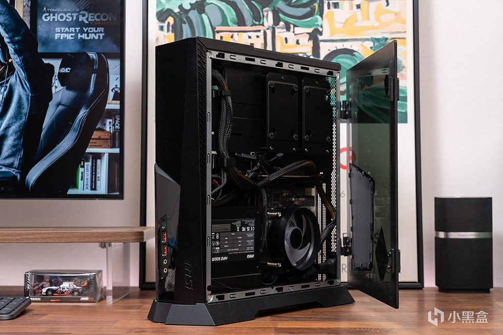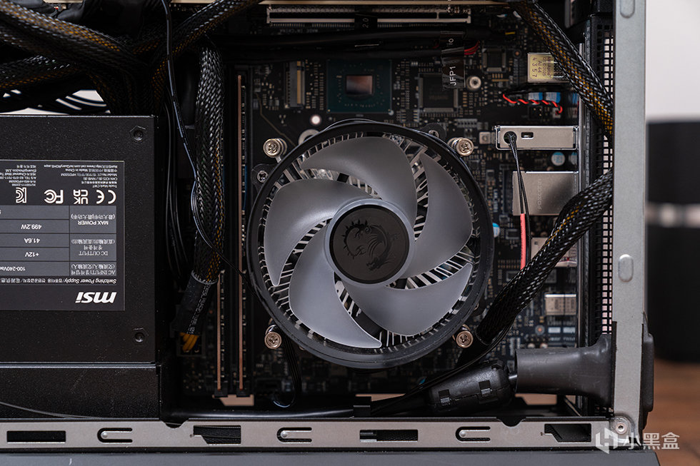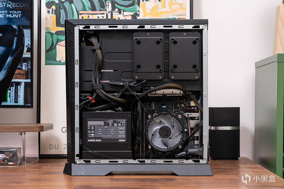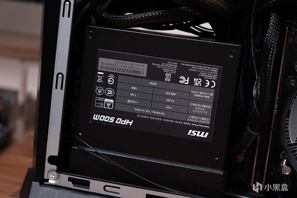 电源选用微星 HPD 500M 规格,线材直出设计减少接口损耗,能源效率更高,向下排风的设计与 CPU 散热器(下压式)形成差异化出风路径,分别从机箱下方和尾部排出热量。机箱上方预留两个 2.5 英寸硬盘支架,电源线已预装到位,玩家可通过配件包中的 SATA 线自行扩展存储。