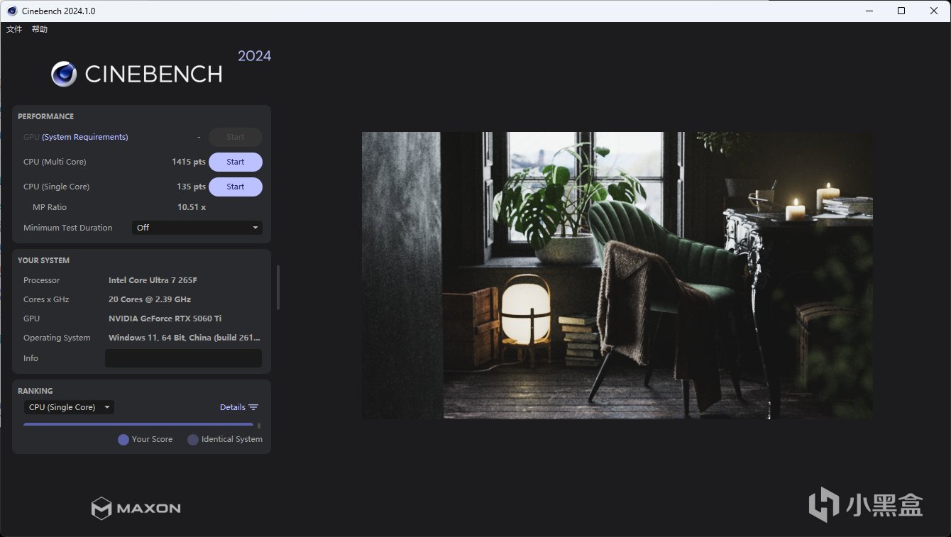 酷睿 Ultra 7 265F 被微星限制在 130W PL2(默认 182W)和 65W PL1 功耗,BIOS 无法解锁,但实际测试中仍能发挥大部分性能。Cinebench 2024 测试中,单线程得分135,pts多线程为1415 pts,体现出稳定的性能释放。