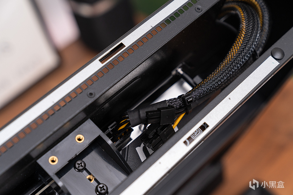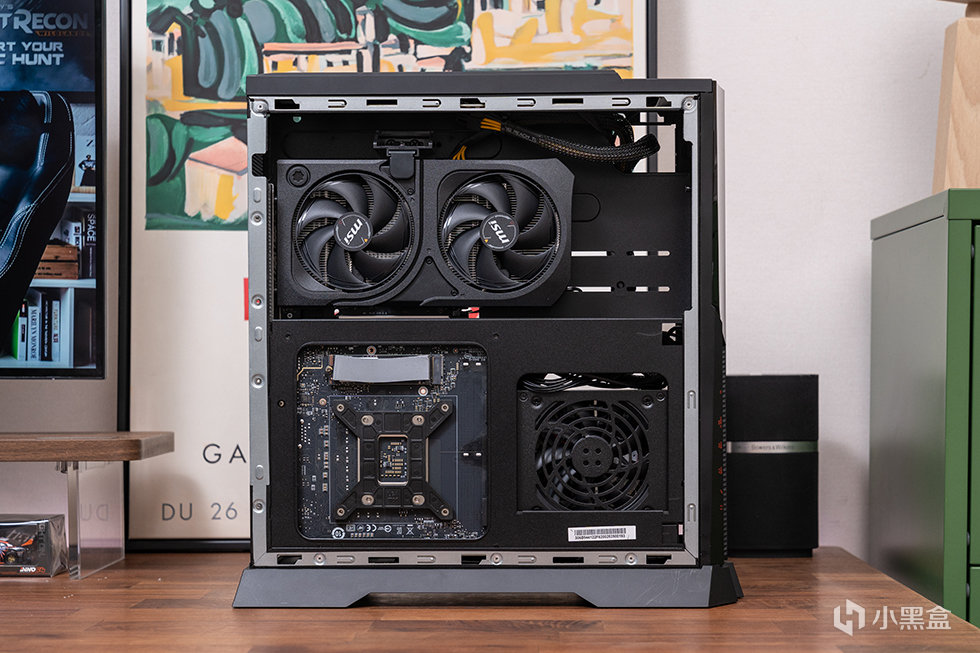 海皇戟 AS 的体积仅为10L,采用定制化内部布局,核心亮点在于分舱散热设计与高效空间利用。主板与显卡分别安装在机箱两侧,通过专用 PCIe 转接卡连接,主板倒置摆放,显卡位于上方,这种布局使 CPU、显卡和电源处于独立气室,避免热量相互干扰。