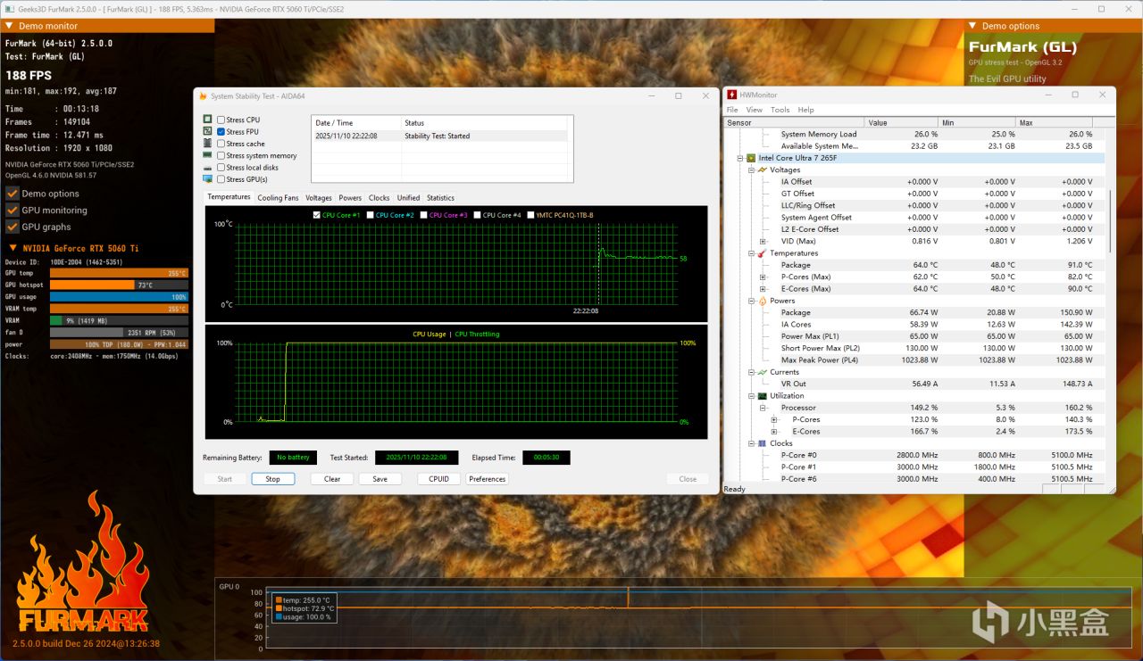 得益于分舱散热设计,双烤测试中,CPU 与显卡温度未出现相互干扰的情况。CPU 散热器与电源风扇的差异化出风路径,配合机身多方位通风口,使整机热量快速排出,极限条件下性能未受明显影响,证明 10L 体积内的散热系统设计成熟。