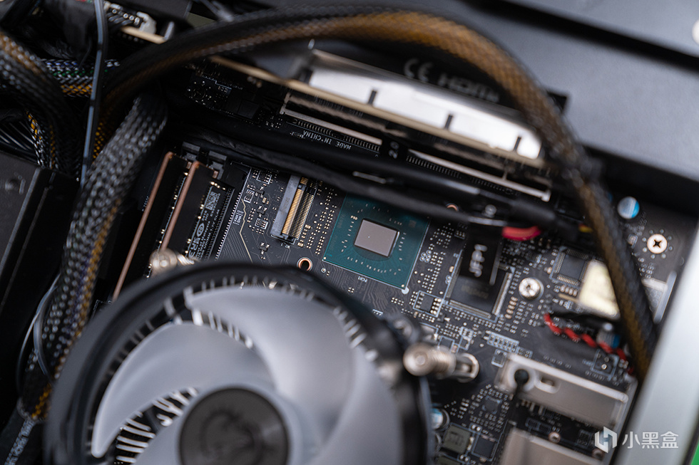 主板采用微星专用 ITX 板型 B860,配备下压式 CPU 散热器形成的持续气流可保证散热需求。主板正面 PCH 上方设有直连 CPU 的 PCIe 5.0 M.2 接口,预装固定旋钮,方便玩家免工具加装 SSD。