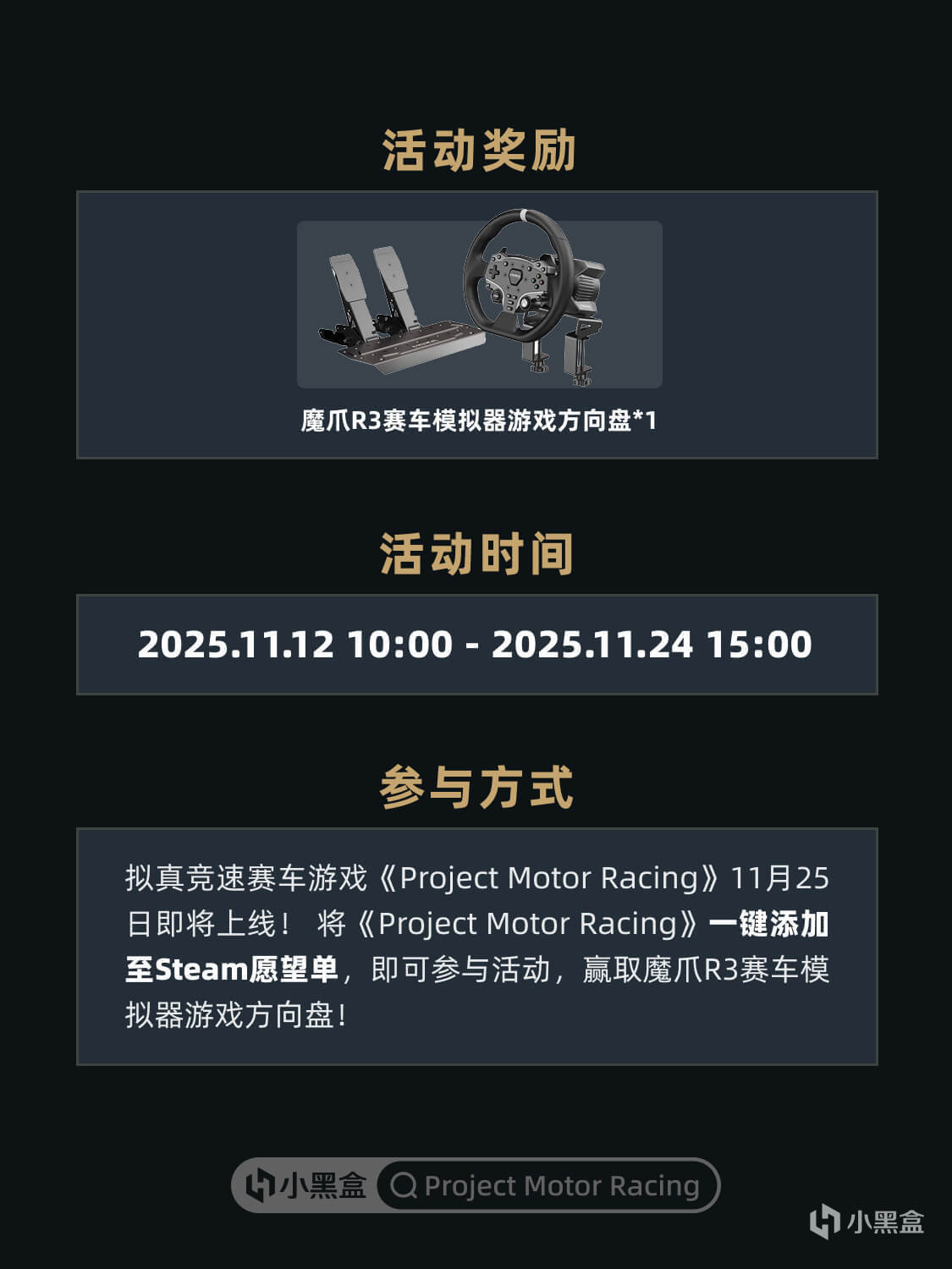 拟真竞速赛车游戏《专业赛车计划》11月25日即将上线!将《专业赛车计划》》一键添加至Steam愿望单(https://api.xiaoheihe.cn/store/roll_room_v2?award_id=4989),即可参与活动,赢取魔爪R3赛车模拟器游戏方向盘!