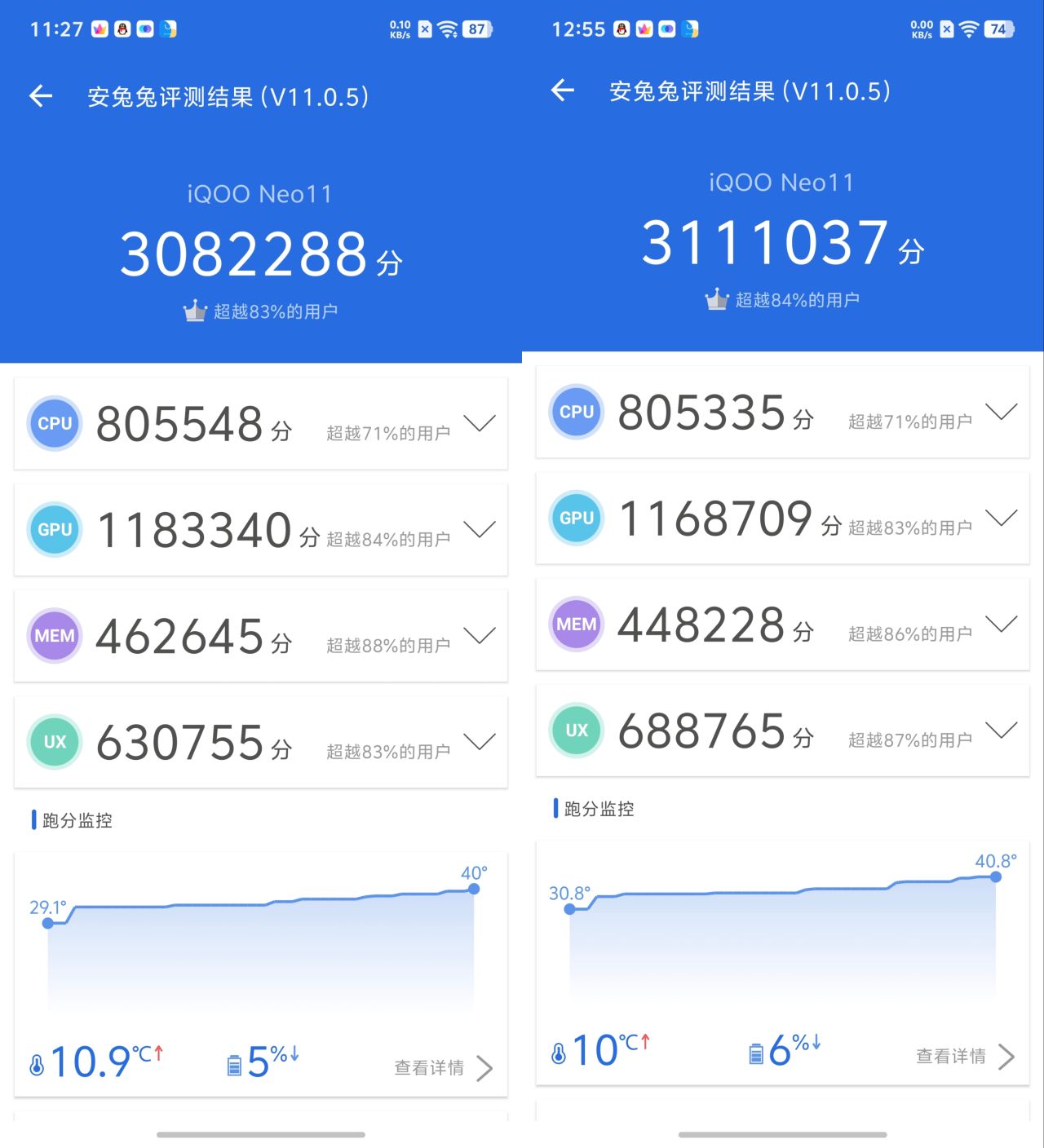 为了防止误差,我又跑了一次测试,这次分数来到311W,两次烤机测试温度都升高10度左右,耗电量约为5%,续航跟散热算是对得起期待了。