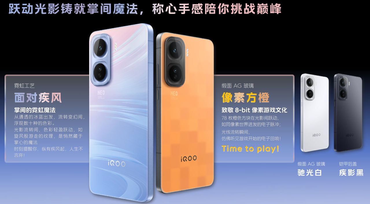 ——颜值的话就各有各的喜好了,而iQOONeo这次玩了点新花样。首先是保留经典的黑白配色,这个没啥好说的;然后这次IQOO放弃了前两代的「撞色设计」(Neo 9红白/Neo 10橙白),两个新配色都回归了经典纯色: