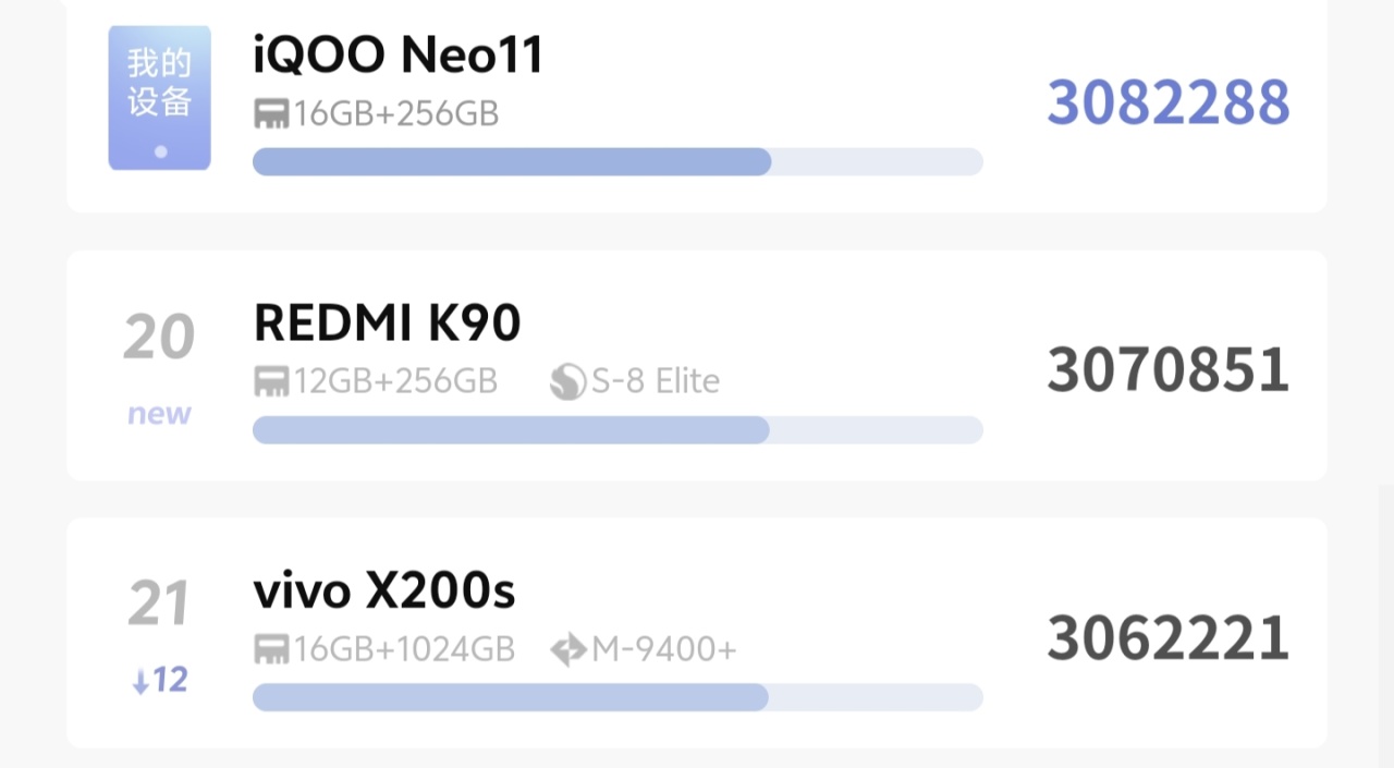 接着再用安兔兔跑个分(图一乐),可以看到308W分,还是比较能打的,天梯榜排名TOP20(用户跑分肯定跟厂家跑有性能差距),刚好压K90一头,这还说啥呢!