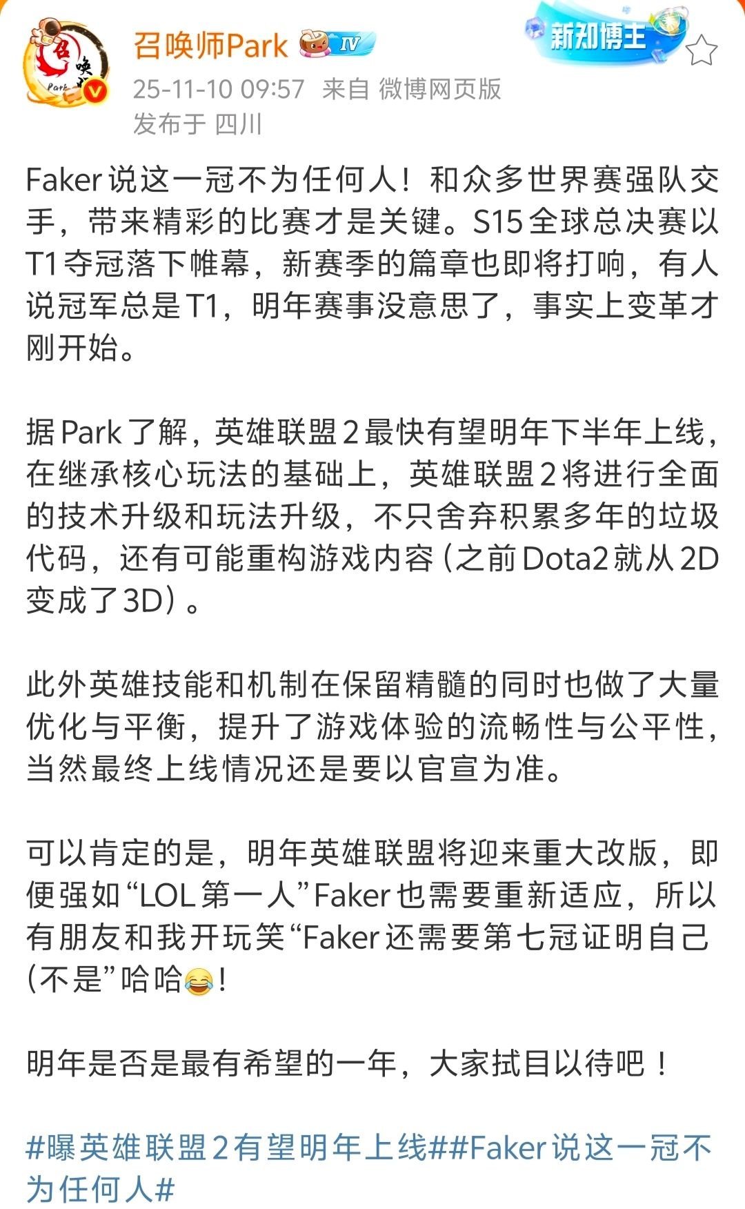 “《英雄联盟2》最快将于2026年下半年上线”的爆料如惊雷般在玩家社区中炸响。这款承载了无数人青春与热血的MOBA经典,从未有过正式续作的官方消息,如今却迎来“全面升级”的传闻,faker或变0冠,急需第一个冠军证明自己!