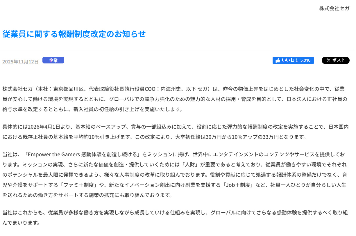 世嘉官方宣布,为应对当前物价上涨等社会环境变化,同时致力于为员工营造安心工作的环境,提升公司在全球范围内吸引和培养优秀人才的竞争力,现决定对日本全体正式员工的薪酬标准进行调整,并提高新入职员工的起薪。