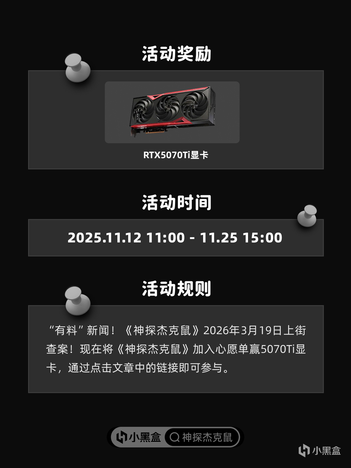 “有料”新闻!《神探杰克鼠》2026年3月19日上街查案!现在将《神探杰克鼠》加入心愿单赢5070Ti显卡,通过点击文章中的链接即可参与。https://api.xiaoheihe.cn/store/roll_room_v2?award_id=4982
