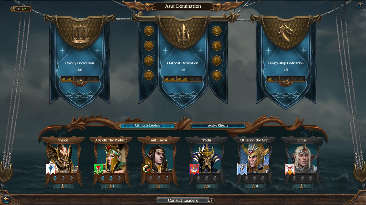艾斯林攻占城镇并将其献给六巨头后,他在其中建造的哨站会产生一种名为「奉献」的新资源。奉献是在阿苏尔霸权面板中,用来升级龙舰、哨站和殖民地各方面的货币。你可以在此解锁新的龙舰,还有龙舰和城镇的建筑序列,增加精灵殖民地的容量,以及众多令人眼花缭乱的战役和战斗增益。