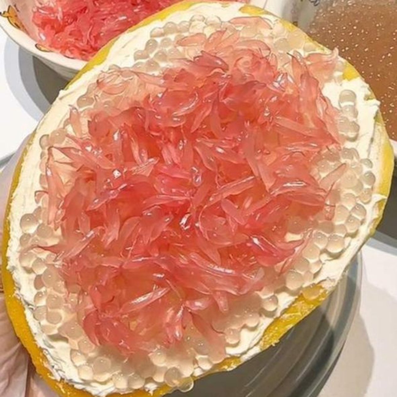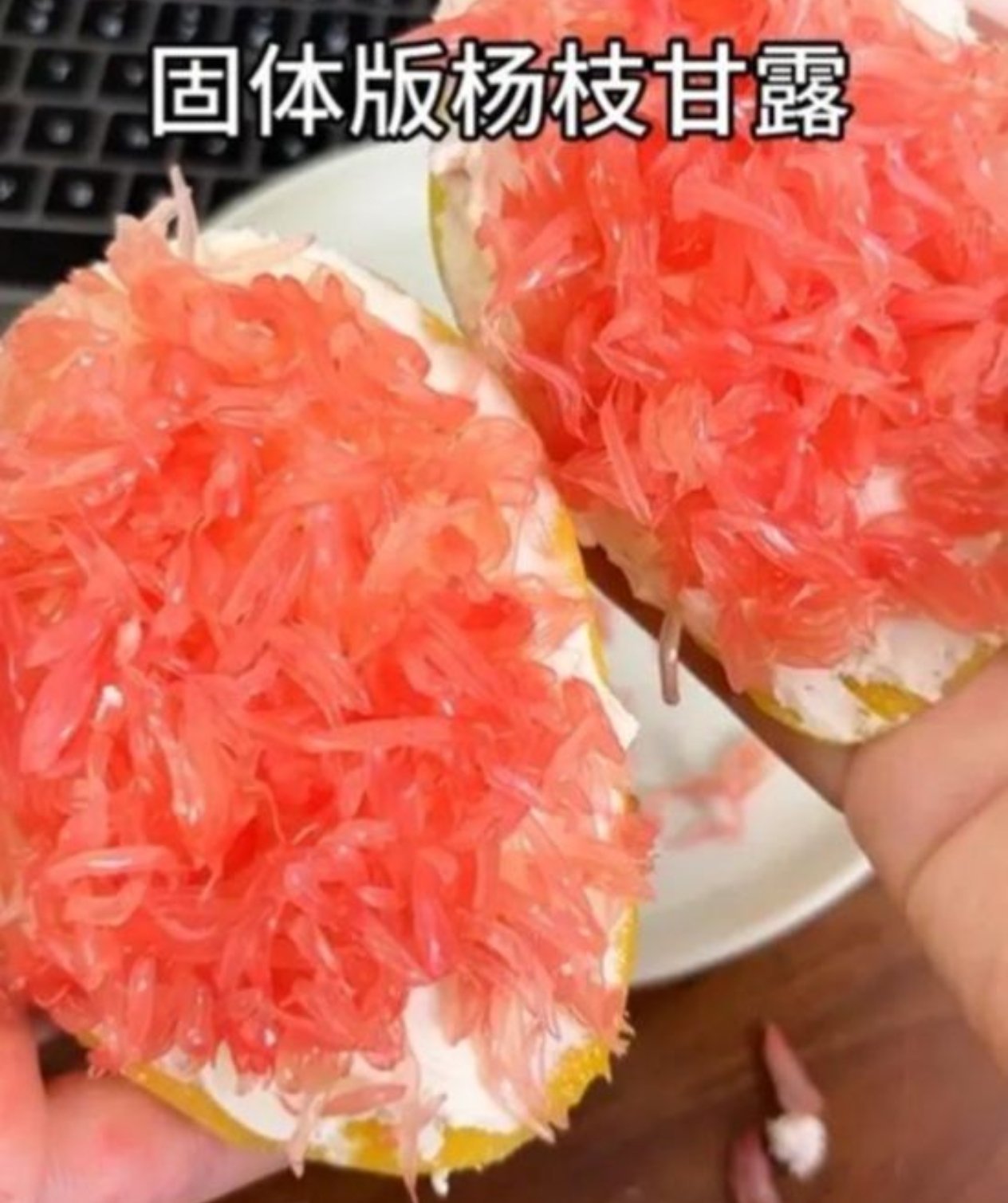 这款将传统港式甜品固态化的创新食品,以整块凯特芒为基底,涂上厚厚干噎酸奶,再点缀西柚粒等配料,从液态变为可手持的“甜品三明治”。其鲜明的色彩搭配和丰富口感,迅速征服社交媒体,小红书相关教程浏览量超千万,抖音话题播放量近6亿。