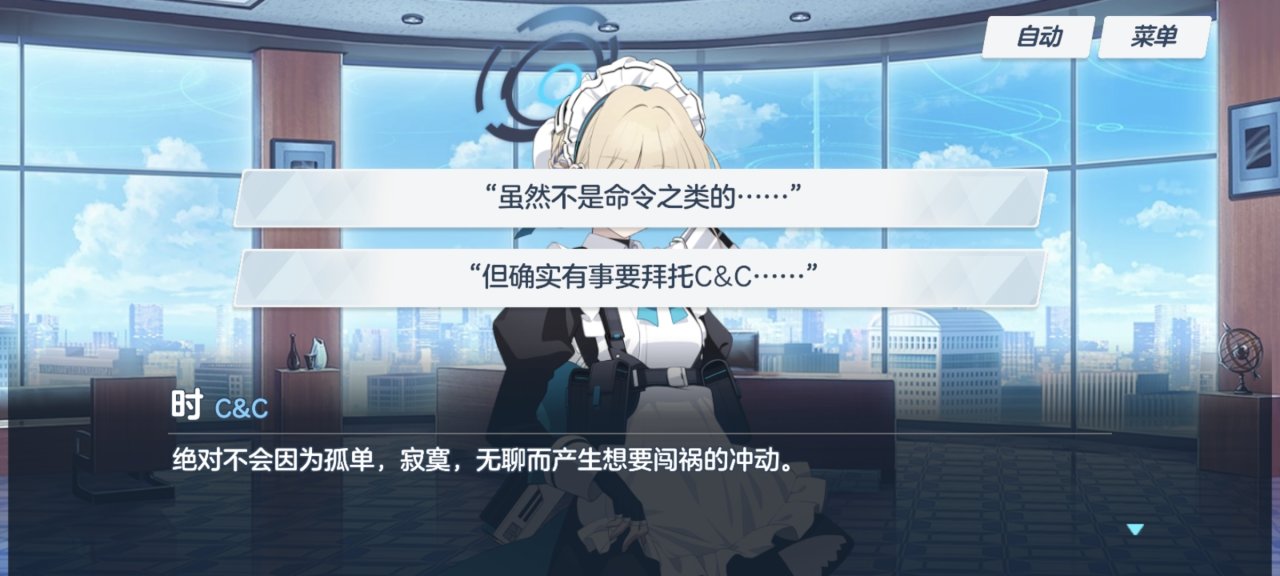不过像BA这种用两个选项来代替主角上下文说的话的,也是很有自己特色的,相较于其它二游的选项,BA的就直白多了,这样利好角色间对话的描写。并且因为无论哪个选项都不会改变路线,选哪个都一样,所以反而能让玩家感到轻松惬意,打心底觉得快活且自在。
