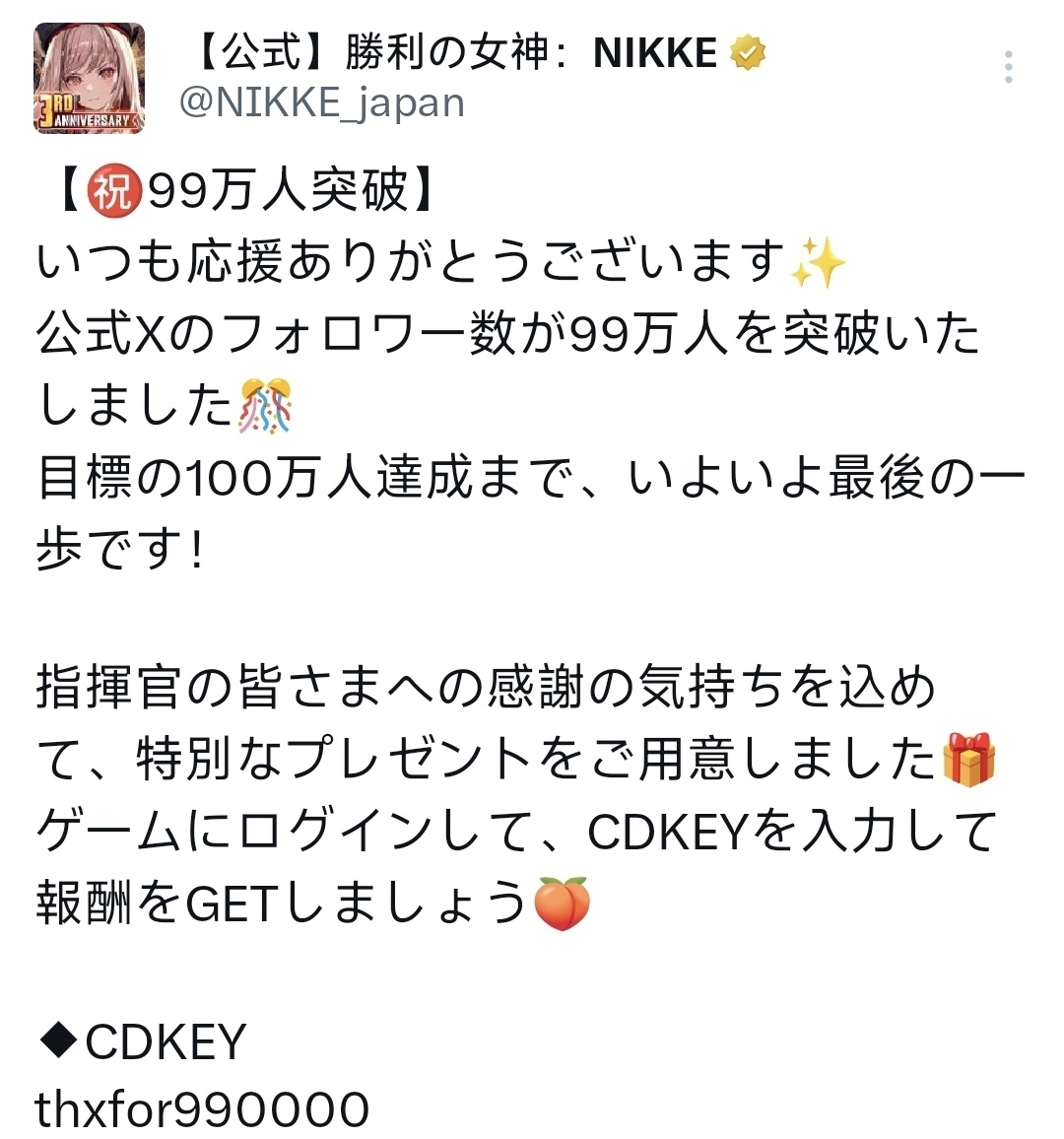 NIKKE日本推特官网更新账号关注已突破99万关注,离百万关注仅差一步之遥!