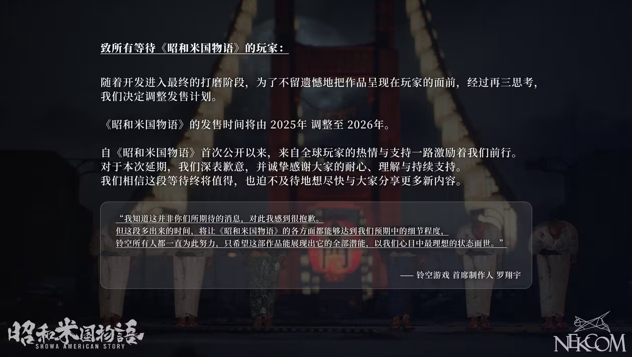 今日,铃空游戏官方宣布《昭和米国物语》延期至2026年发售(原定2025年第四季度)。官方表示随着开发进入最终的打磨阶段,为了不留遗憾地把作品呈现在玩家的面前,经过再三思考,决定调整发售计划。