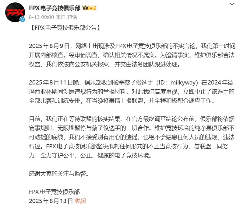 在今年的8月份,有网友在微博上举报Milkyway在RNG期间贩卖德杯BP,并公布多张聊天记录,对此FPX官方第一时间上报联盟等待结果,并在调查公布前无限期暂停与选手合作。