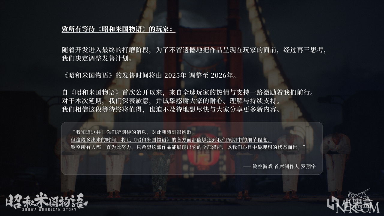 自《昭和米國物語》首次公開以來,來自全球玩家的熱情與支持一路激勵着我們前行。 對於本次延期,我們深表歉意,並誠摯感謝大家的耐心、理解與持續支持。 我們相信這段等待終將值得,也迫不及待地想盡快與大家分享更多新內容。