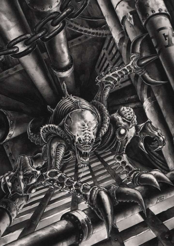 這些雜交體的後代們如同披着羊皮的狼,混跡在人類的羣體中。他們會普通人一般在人類工業世界衰敗的機械間辛勤勞作,沒有人會專門觀察他們。但在他們的工作服和粗糙的服飾之下,所有人都帶着異形的印記。