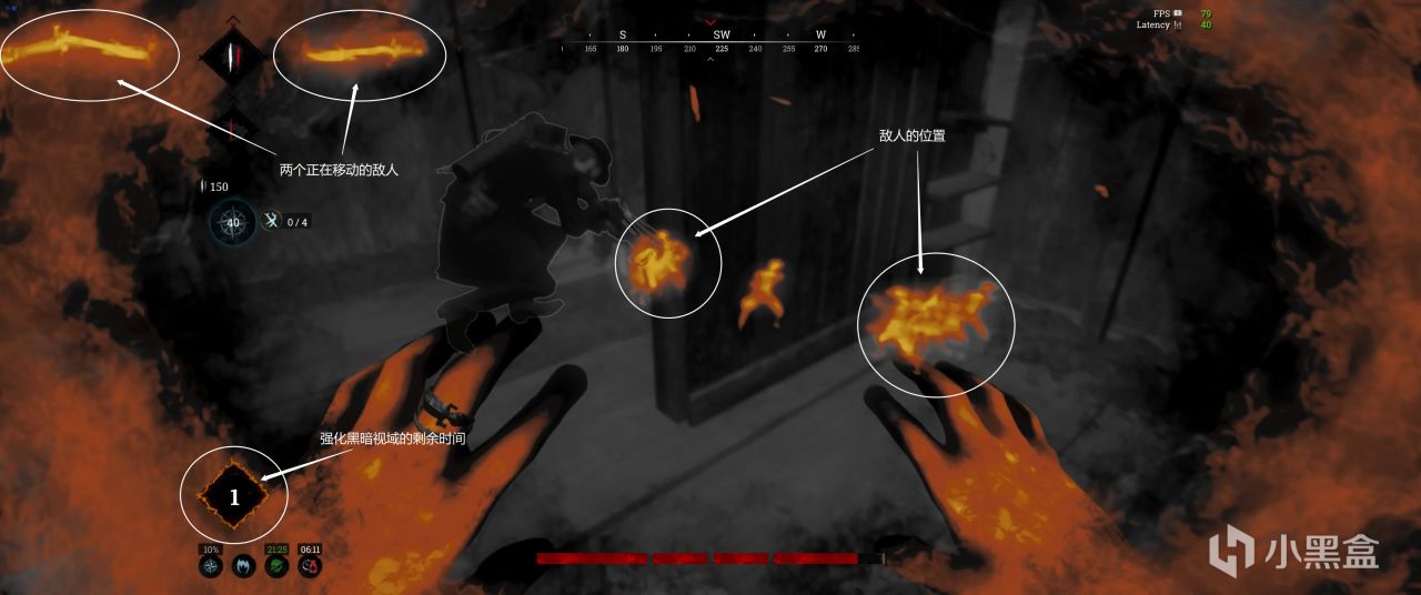打完boss拾取令牌,這個令牌無論誰帶最後都是有錢的,所以一般是交給意識好的帶,去看敵人位置,在攜帶令牌的情況下,黑暗視域會獲得變化。黑暗視域一週變爲橙色說明75m範圍內有敵人,在黑暗視域下按右鍵,可以看到150m範圍內敵人的身影,勻速的360°轉一圈正好就是一秒