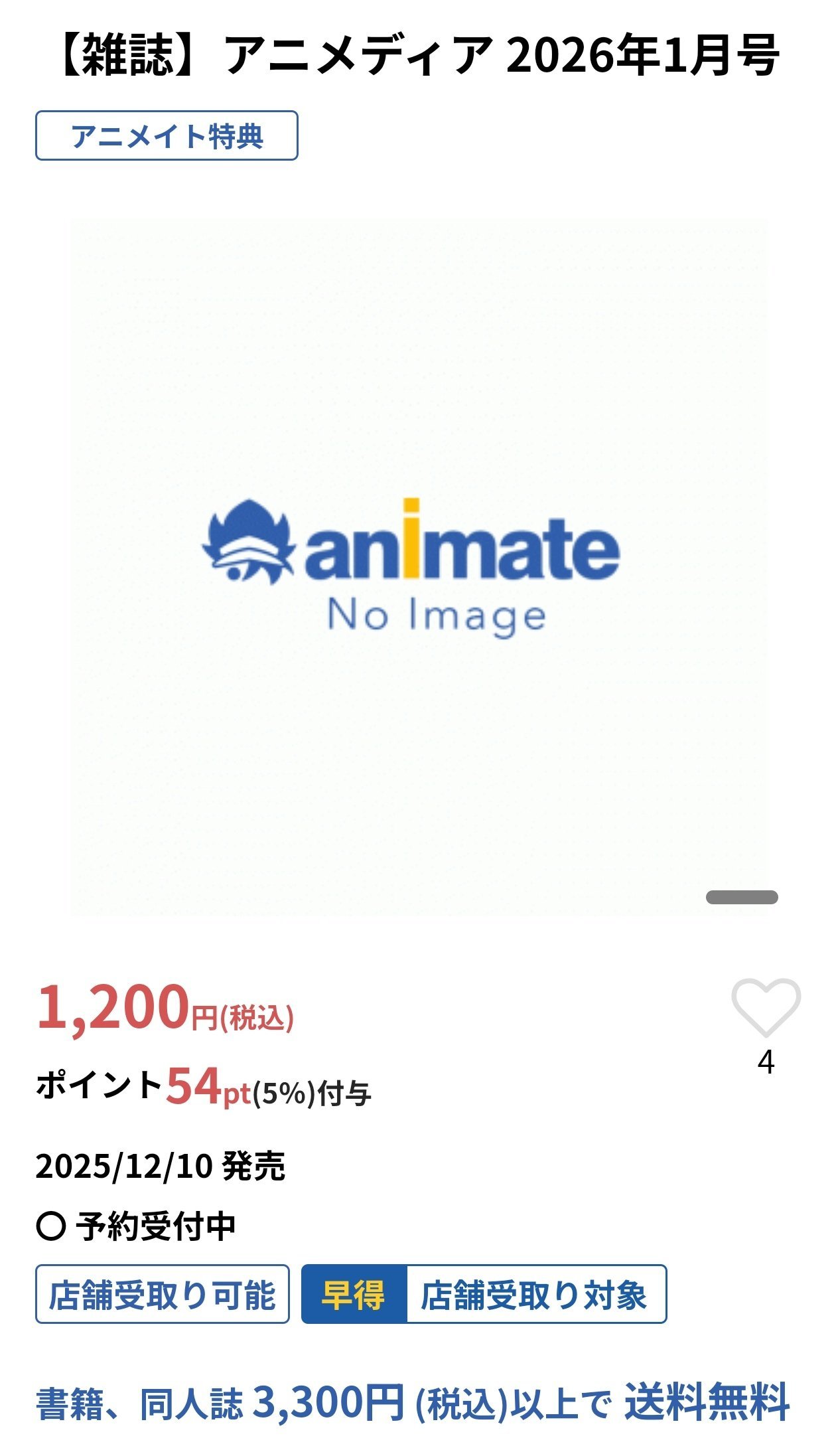 在Animate购买《Animedia 2026年1月号》,可获赠“明信片”作为特典。