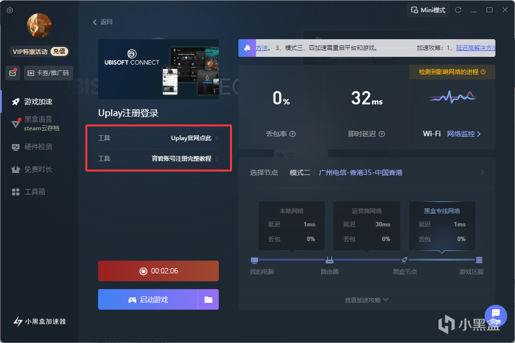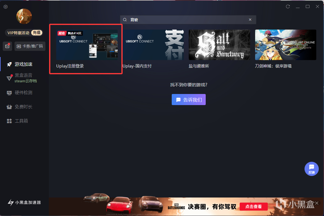 首先我們打開小黑盒加速器,搜索育碧點擊Uplay註冊登錄