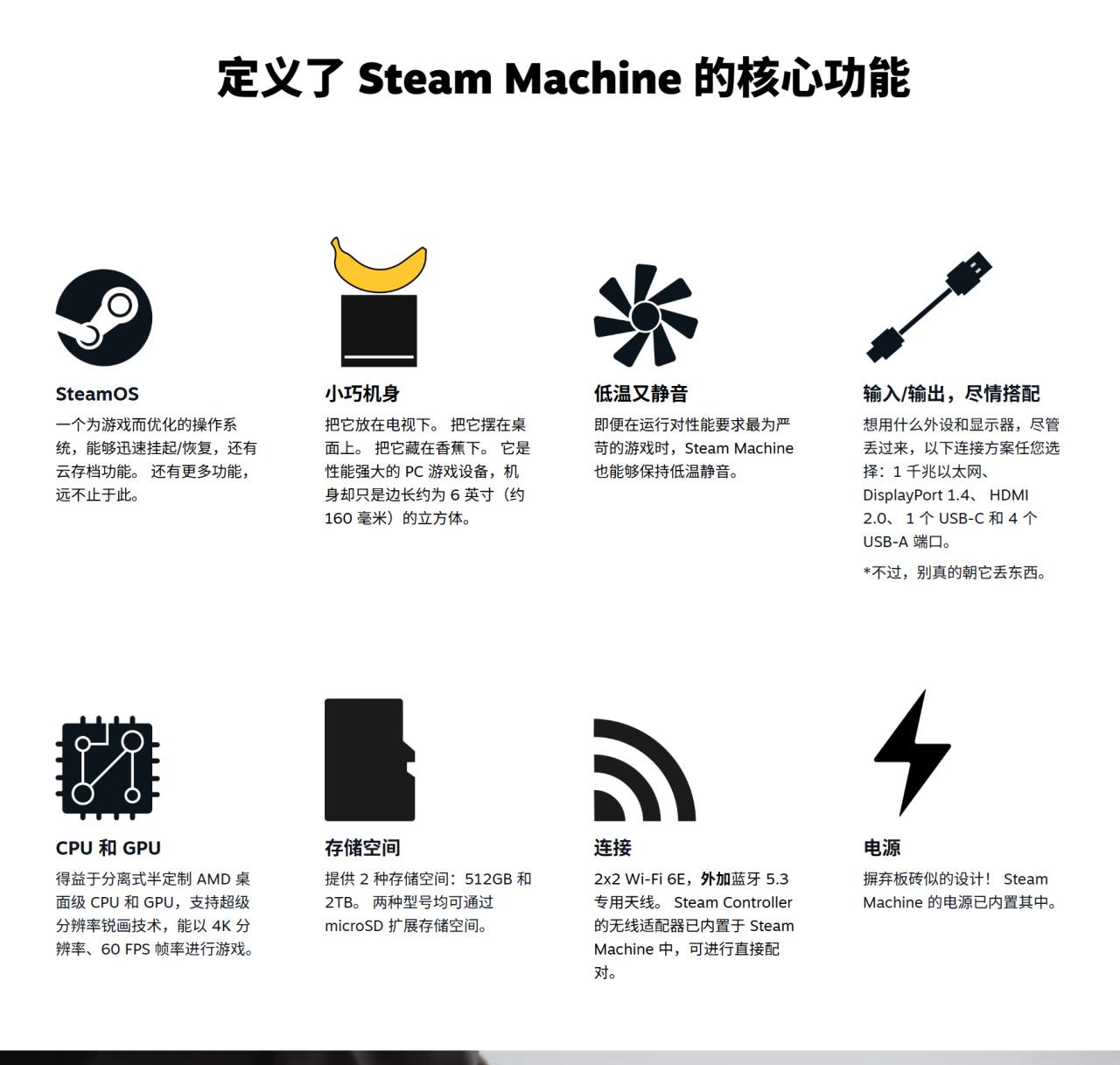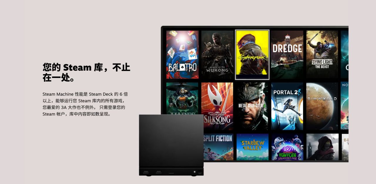 Steam Machine 运行的是 Valve 以游戏为本的操作系统。 SteamOS 旨在带来“即插即玩”式的用户体验,同时仍然保留 PC 的强大功能和灵活性。 尽请享受与 Steam Deck、Steam Frame 等其他 Steam 硬件如出一辙的 SteamOS 体验。