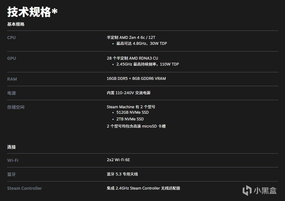 2x2 Wi-Fi 6E,外加蓝牙 5.3 专用天线。Steam Controller 的无线适配器已内置于 Steam Machine 中,可进行直接配对。