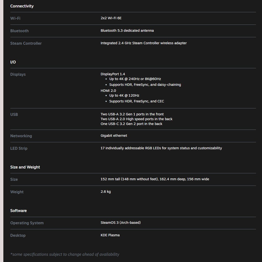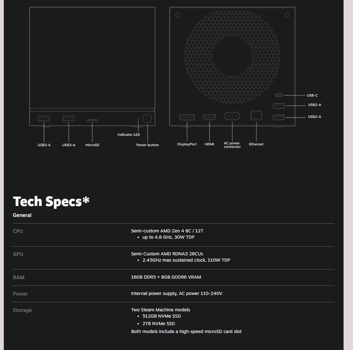 搭载半定制6核12线程AMD Zen 4处理器与28计算单元RDNA 3显卡,Steam Machine在强劲性能与能效间取得平衡。散热系统专为静音运行设计,连接选项包含Wi-Fi 6E、蓝牙5.3、千兆以太网、DisplayPort 1.4、HDMI 2.0与多USB接口。系统配备16GB DDR5内存、8GB GDDR6显存与最高2TB NVMe固态硬盘,运行基于KDE Plasma的SteamOS 3系统。