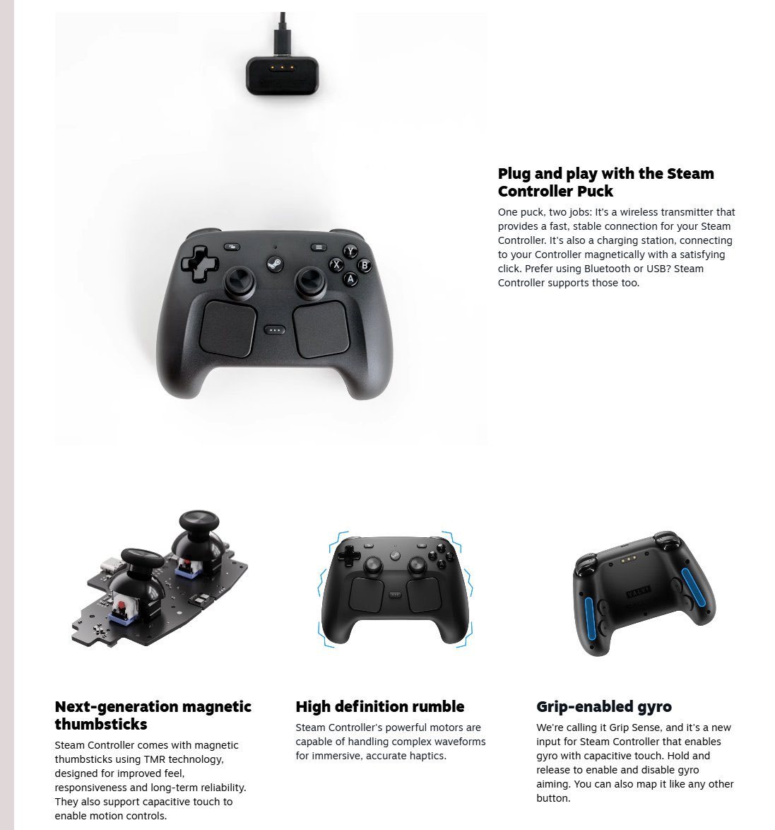 连接性能通过Steam Controller Puck实现现代化升级,这款低延迟2.4GHz发射器兼作磁吸充电底座,实现约8毫秒延迟与超35小时续航。设备同时支持蓝牙与USB-C连接,兼容Windows、macOS、Linux、Steam Deck、Steam Machine及Steam Frame平台。