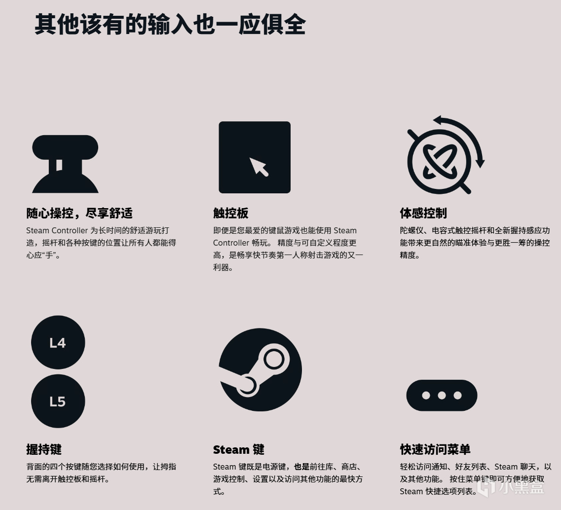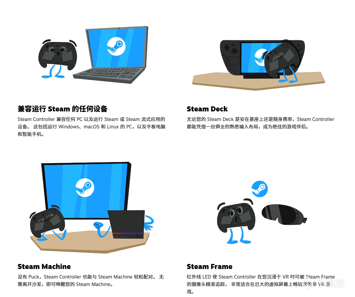 從官方發的圖可以看到該手柄兼容兼容運行 Steam 的任何設備,這幾個動態圖還挺可愛的有機會的可以自己看一下((