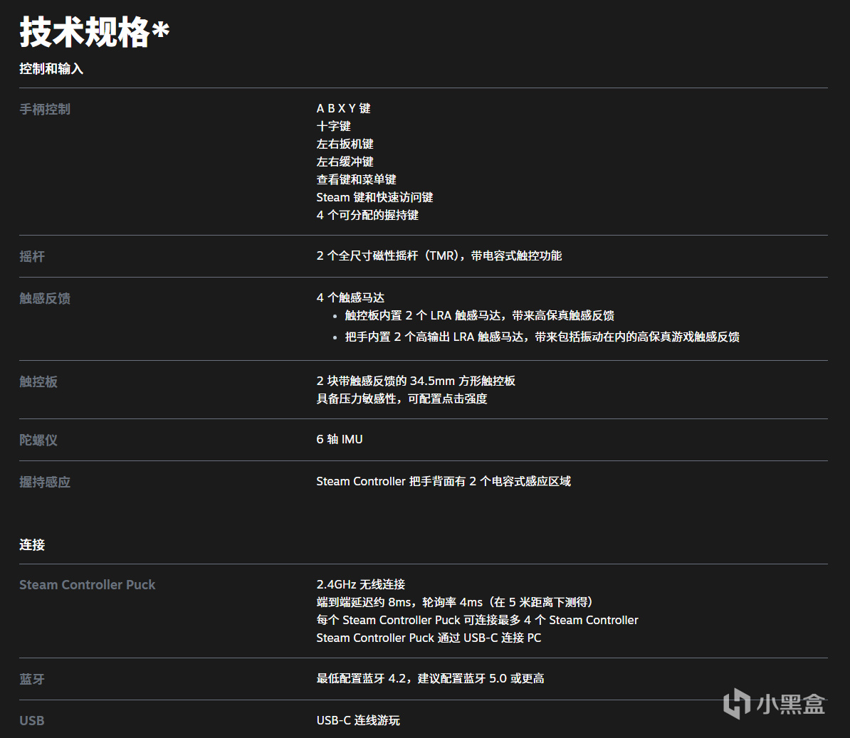 • Steam Controller Puck:支持 2.4GHz 無線連接,端到端延遲約 8ms(輪詢率 4ms,在 5 米距離下測試),每個 Puck 可連接最多 4 個控制器;Puck 通過 USB-C 接口連接 PC。