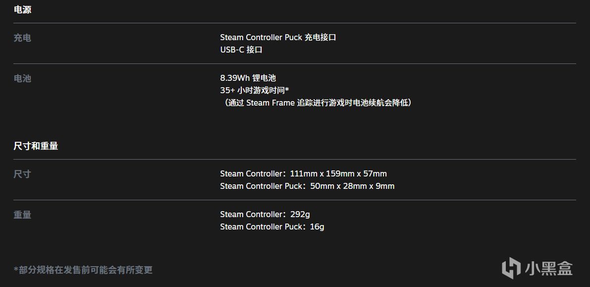 • 尺寸:Steam 控制器爲 111mm × 159mm × 57mm;Steam Controller Puck 爲 50mm × 28mm × 9mm。