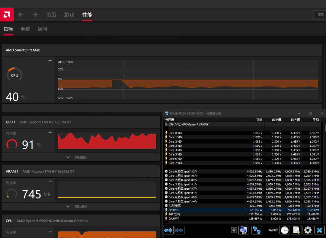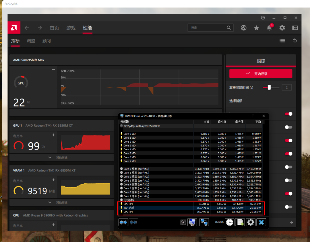 單獨運行《孤島驚魂6》可以看到Radeon RX 6850M XT功率約爲169W,此時AMD Smartshift MAX監視器顯示總功率輸出偏向獨顯22%
