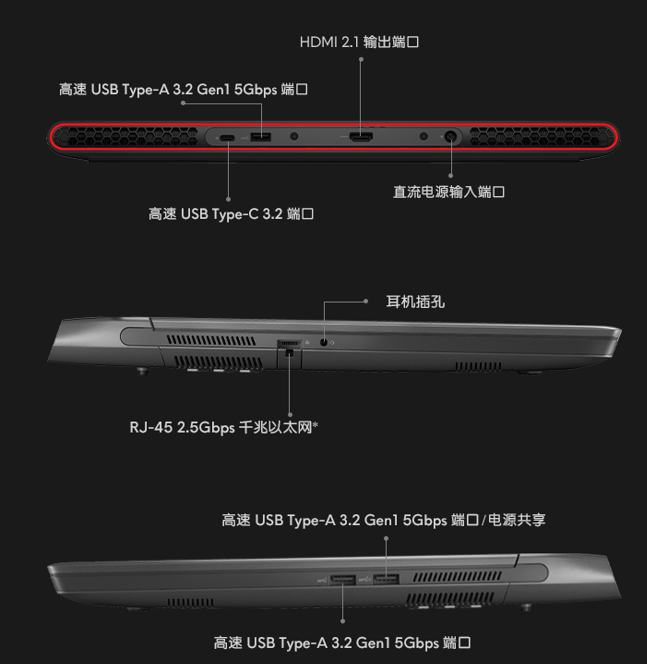 接口部分,機身左側是2.5Gbps有線網卡接口和耳機插孔,右側則有兩個USB 3.2 Gen1 Type-A接口,其中一個支持電源共享。機身尾部提供的是一個USB 3.2 Gen1 Type-A接口和一個USB 3.2 Type-C接口,另外還有一個HDMI 2.1和電源適配器接口(標配240W適配器)。
