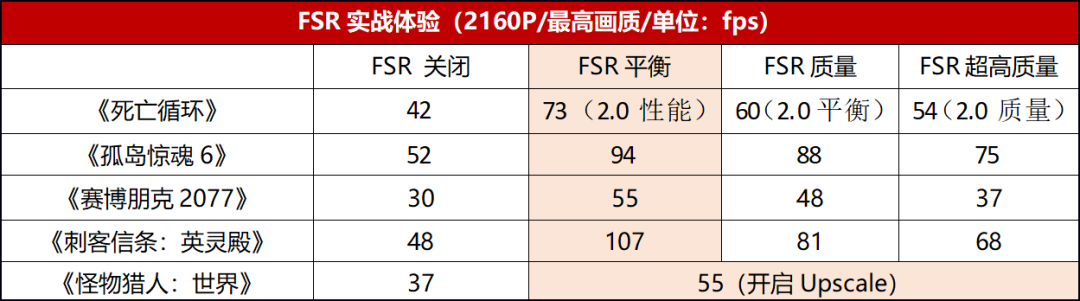 從實測來看,開啓FSR 2.0後,2160P最高畫質下《死亡循環》的平均幀率分別巨幅提升74%(性能)、43%(平衡)、29%(質量),而就算是性能模式下的畫質也可以媲美原生畫質,而73fps的幀率已經完全可以滿足流暢玩耍的需求了。其他FSR 1.0的遊戲在開啓FSR之後,相對原生2160P最高畫質的平均幀率也有了巨大的提升,《孤島驚魂6》最多提升81%、《刺客信條:英靈殿》最多提升123%、《賽博朋克2077》最多提升83%、《怪物獵人:世界》提升49%。