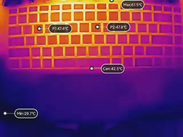 最後我們還用海康微影K20熱像儀觀察了外星人m17 R5玩遊戲時的鍵盤溫度。從圖上可以看到,《孤島驚魂6》考機一小時後,鍵盤區域最高溫度在47℃左右,腕託部分不到30℃,長時間玩遊戲手也不會感覺特別熱,這還是在重慶空前高溫、我們測試實驗室的室溫高達28℃這樣比較熱的環境下,常規環境下溫度會更低。總的來說,外星人m17 R5的使用體驗還是做得很到位的。