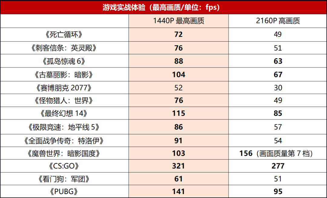 1440P最高畫質下,除了《賽博朋克2077》這種優化差、要求又極爲苛刻的遊戲之外,其他遊戲的平均幀率都可以達到60fps以上,多數3A遊戲可以保持70fps+~90fps+的幀率,而電競網遊類則普遍保持了100fps以上的幀率,流暢度完全有保障。