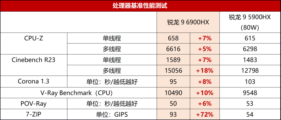 銳龍9 6900HX相對上代產品有了全面的提升,單核性能提升約7%,多核性能在不同的軟件中提升5%~18%不等。而且特別搶眼的是,由於銳龍9 6900HX搭配的是DDR5 4800內存,相比銳龍9 5900HX搭配的DDR4 3200內存帶寬提升非常大,所以7-ZIP的得分領先幅度高達72%。