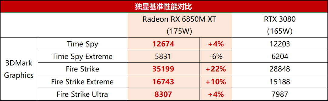 綜合來看,Radeon RX 6850M XT的光柵化基準性能比RTX 3080大約強7%。
