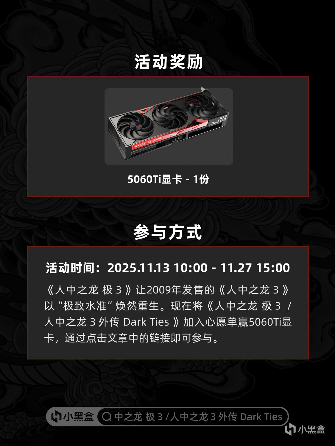 現在將《人中之龍 極3 / 人中之龍3外傳 Dark Ties 》加入心願單贏5060Ti顯卡,通過點擊文章中的鏈接即可參與。https://api.xiaoheihe.cn/store/roll_room_v2?award_id=5016