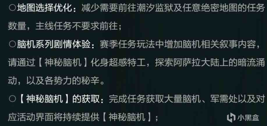 地图选择优化,减少了监狱以及绝密地图的任务数量,主线任务不再要求,并且新增加了脑机相关内容,脑机可以在军需处购买也可以在任务中获取!