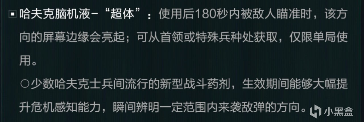 脑机液--“超体”,只可以在本局中使用,使用后被敌人瞄准屏幕会产生高亮提醒(这下听不清脚步的鼠鼠有救啦!)