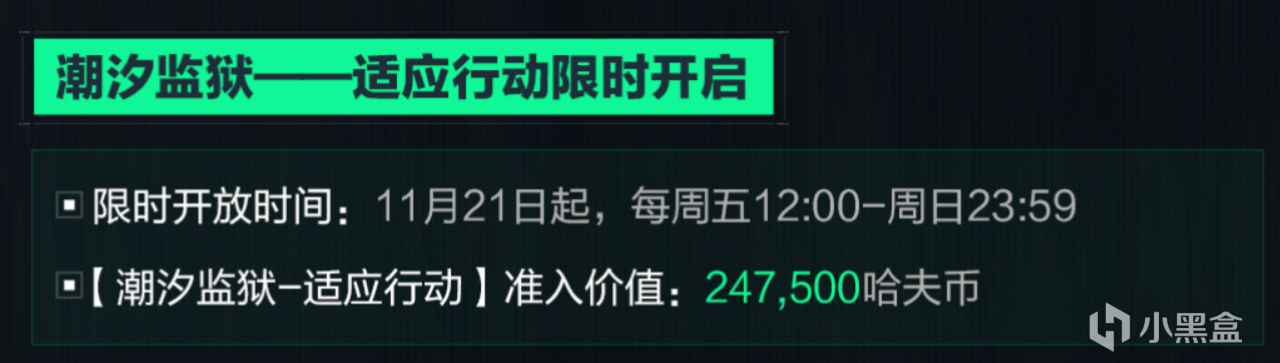 潮汐监狱----适应行动从11月21日开始,此后每周五12点到周日开启。准入价值为246,500哈夫币,至于物品爆率等没有过多提及。